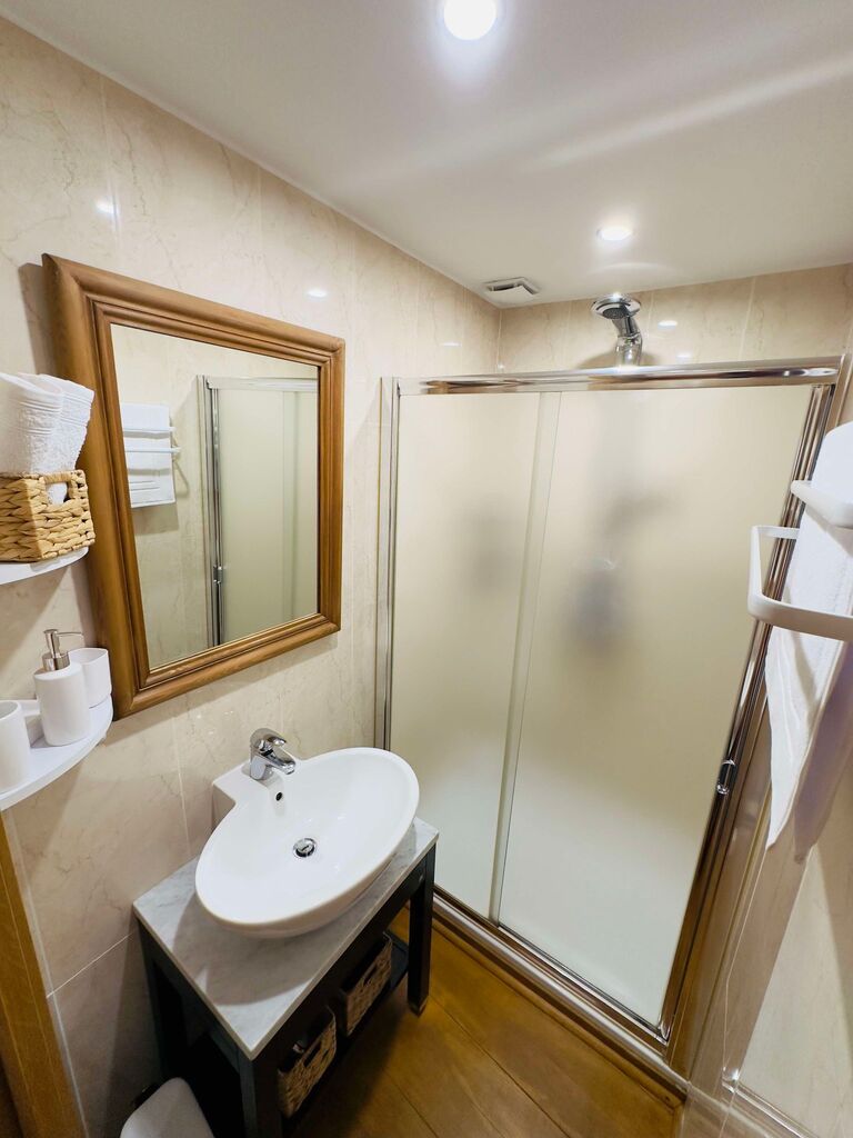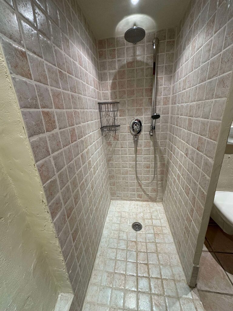 Buanderie avec lave-linge, sèche-linge, salle d’eau (douche + WC).