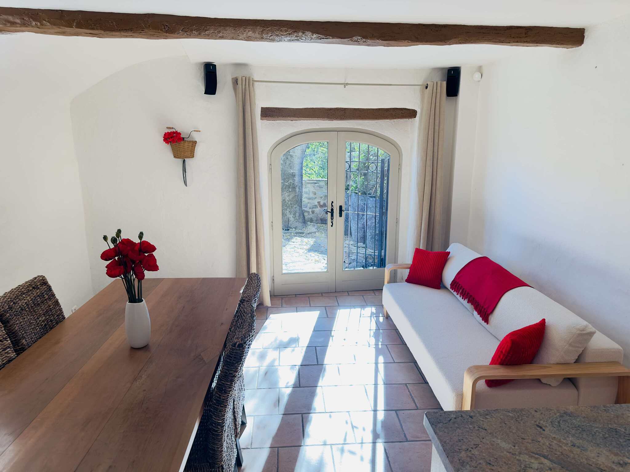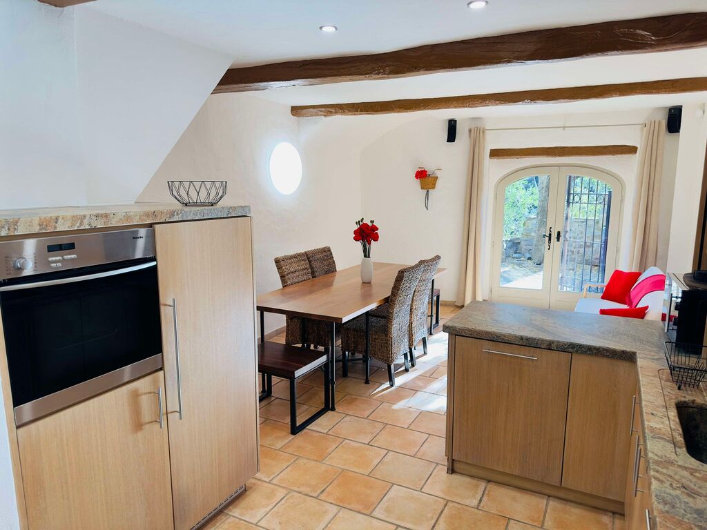 Cuisine d’été entièrement équipée (lave-vaisselle, micro-ondes, congélateur, cafetière à dosettes) avec salle à manger et salon.