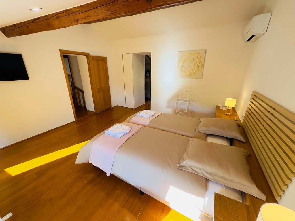Une chambre climatisée avec deux lits (80 x 190), télévision, salle de bains attenante et WC.